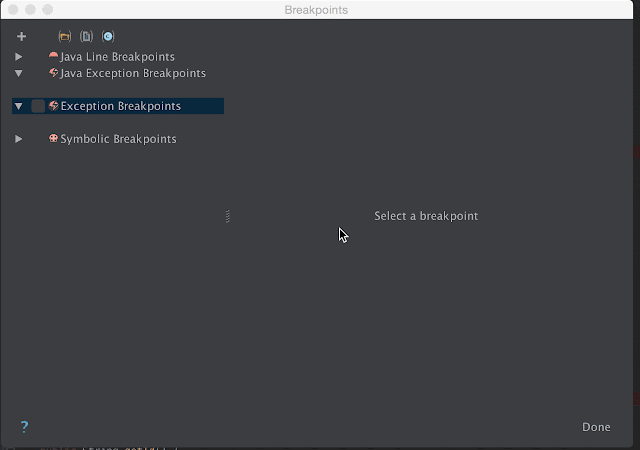 This means that even without actual breakpoints – as long as the debugger is attached to the process – Android Studio will suspend the process on the exact line that will throw the exception. Very easy way of narrowing down on the root cause!